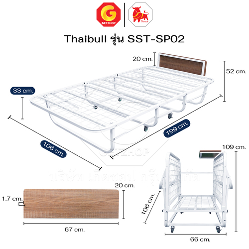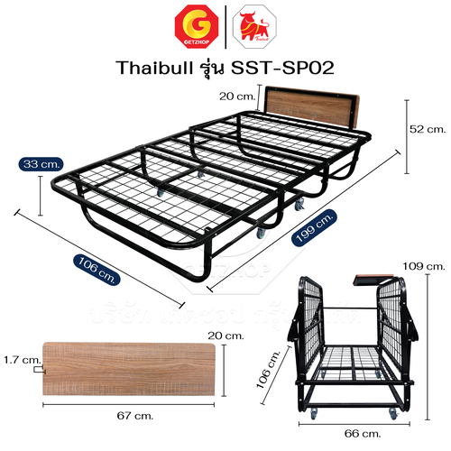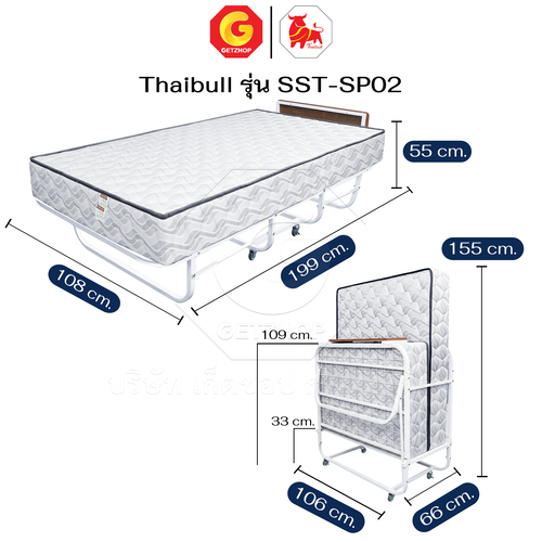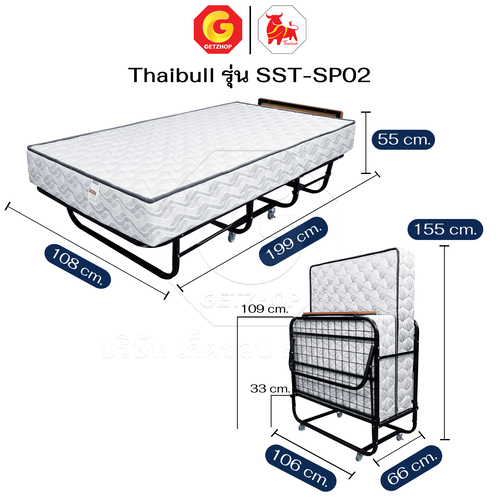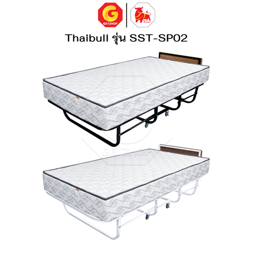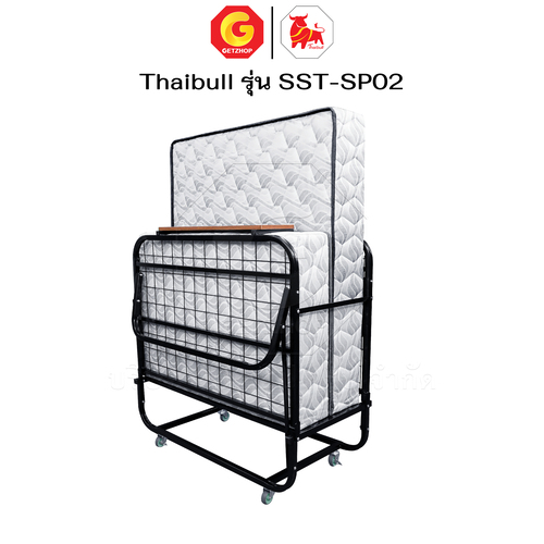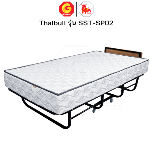 Thaibull Bed with 2-fold topper, hotel extra bed, iron bed with cushion, size 3.5 feet, thickness 8.5 inches, foldable, model SST-SP02 (with wheels)