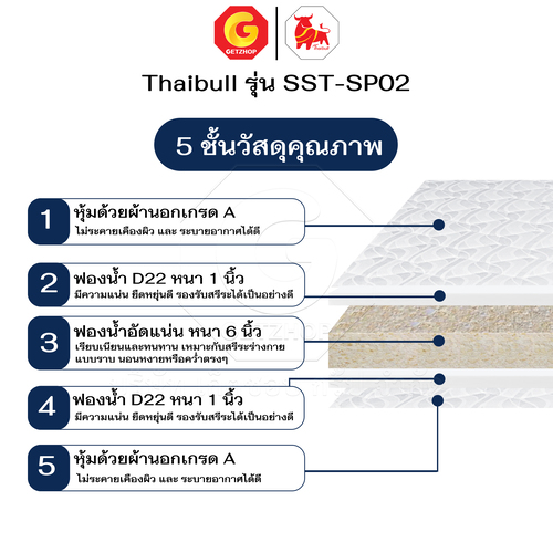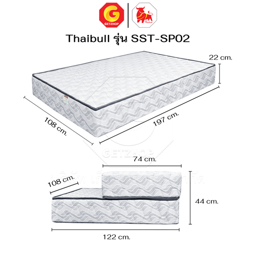 Thaibull mattress, 2-fold topper, foldable cushion, size 3.5 feet, thickness 8.5 inches, model SST-SP02, made in Thailand, is very popular in 3-5 star hotels. The mattress is designed to fit the user’s body, reducing pressure and providing a soft, firm touch, weighty, not collapsing, and regains its shape well. It helps increase weight support efficiency and helps you get a full rest.