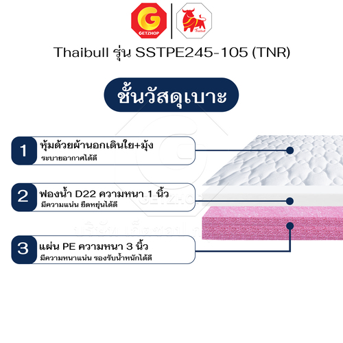 4.วัสดุชั้นในประกอบด้วย : แผ่น PE (Polyethylene Foam) เสริมความแน่น รองรับแรงกดทับได้ดี หุ้มด้วยผ้า (JACQUARD)